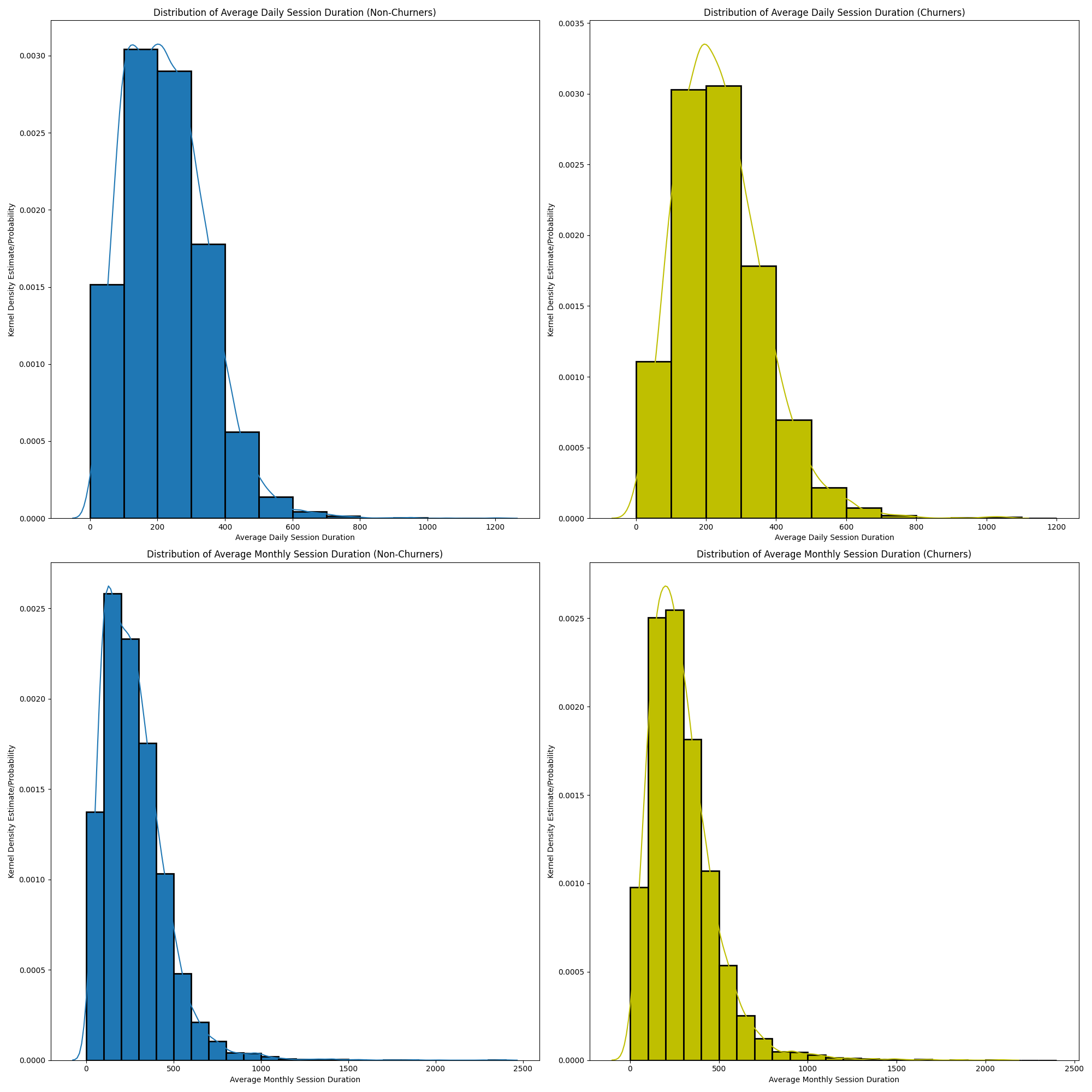 Je hebt deze waarschijnlijk al aan zien komen, als we het aantal sessies per tijdsperiode weten, kunnen we net zo goed de sessieduur tussen churners en niet-churners vergelijken, aangezien we de tijd van elke interactie hebben.